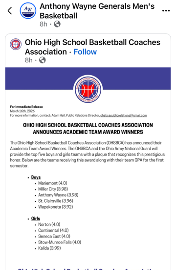 3.8 GPA Team Average for AW Boys Basketball Team